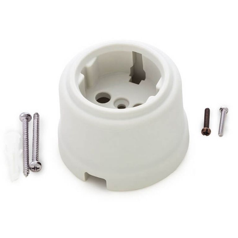 Комплектность: Корпус розетки белый керамический с з/к, пластиковый механизм розетки 16A 250 V, два комплекта винтов хром, бронза.