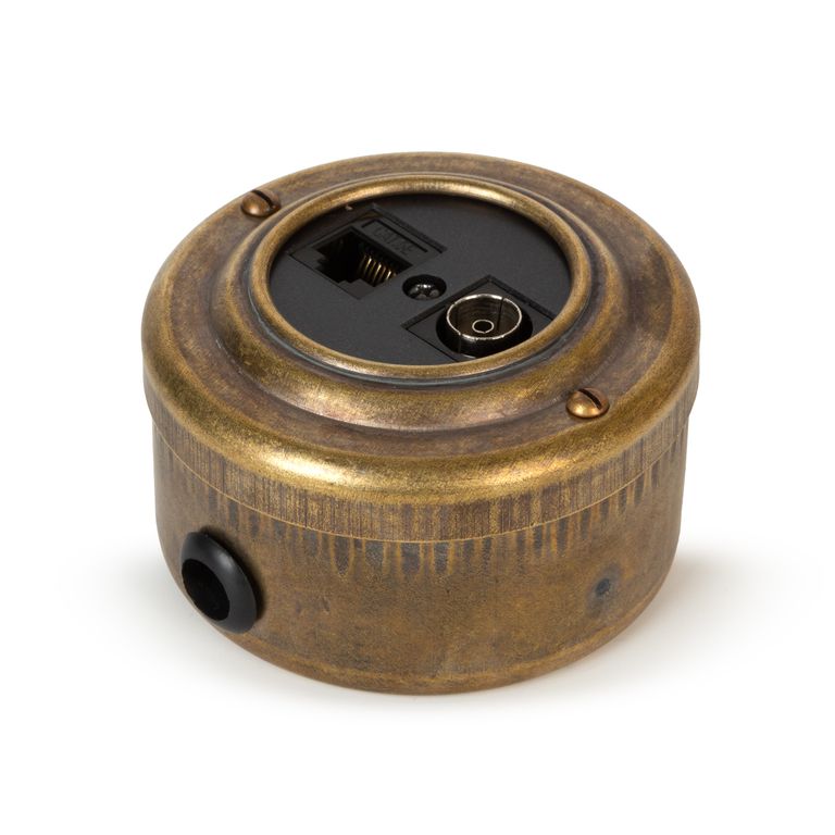 Розетка ретро компьютерная+ТВ "Бронза". Телевизионная и компьютерная розетка в одном корпусе. ТВ розетка - оконечная, механизм розетки компьютерной - RJ-45, кат.5е, UTP модуль (8 контактов). Материал корпуса - металл, покрытый порошковой краской.
